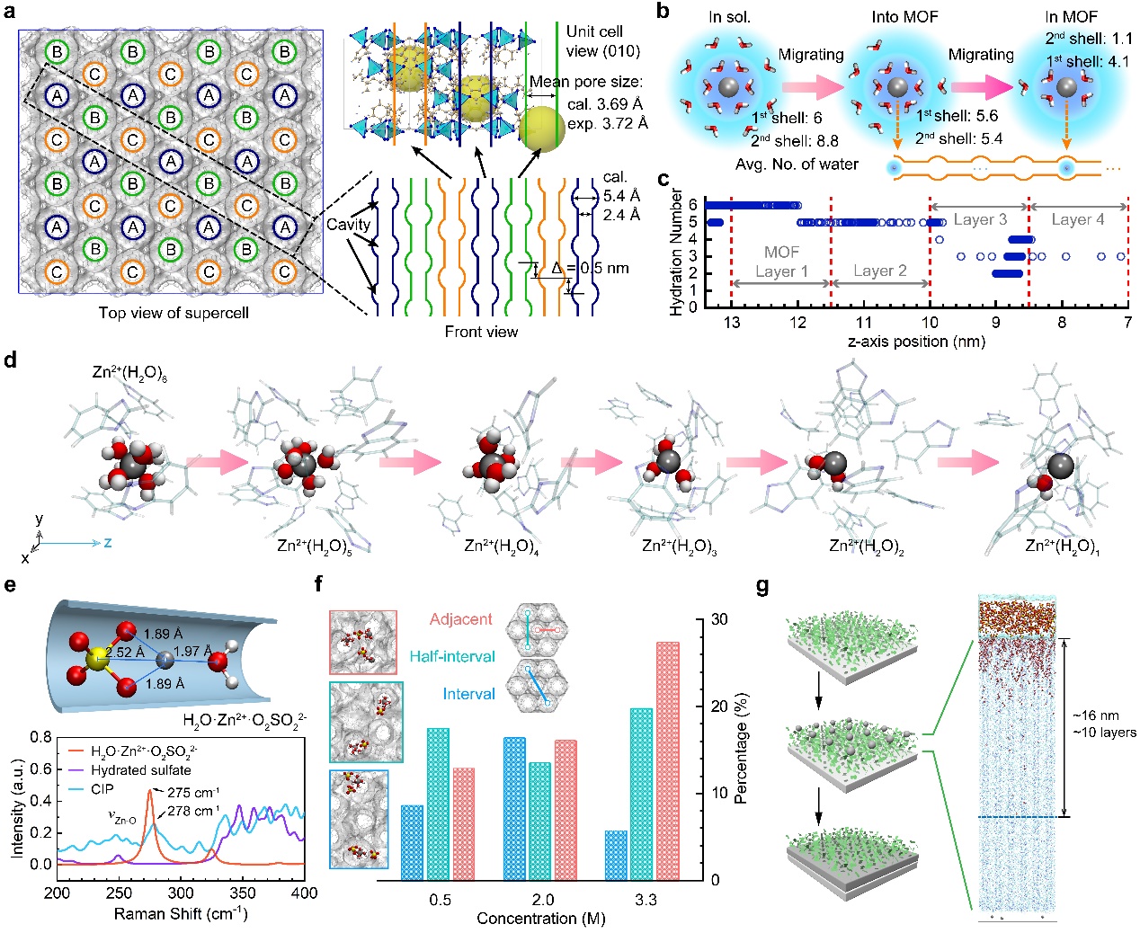 近日,澳门六合彩资料库-澳门六合彩资料网站 的何晓教授和杨金荣副研究员团队聚焦这一底层机制,以ZnSO4电解液和沸石咪唑酯骨架ZIF-7负极保护膜为概念验证,使用理论计算模拟系统探讨了其电解液结构,揭示了溶剂化水合锌离子通过膜层逐步脱水的机理,并据此提出了降低膜厚度至~16 nm和在ZIF-7表面修饰亲水基团来降低脱水,加速锌离子扩散的策略。相关工作在线发表在化学领域顶级期刊《德国应用化学》上(Angew. Chem. Int. Ed. 2023, e202307274),并被评为VIP文章(Very Important Paper)。